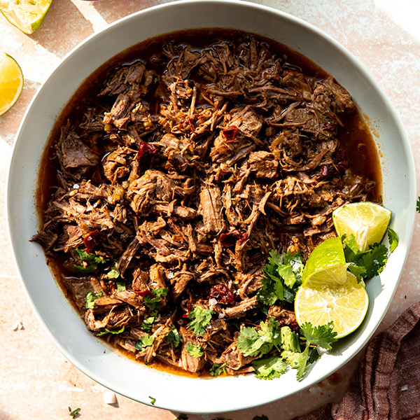 A classic Barbacoa recipe that is fall-apart tender! Beef braised low and slow with adobo chiles, spices and green chiles. The end result is a juicy, flavorful shredded beef to be used in many different ways. Tacos, burritos, salads and more!