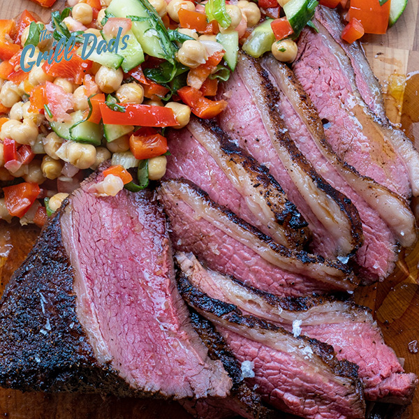 5) Return the steak to the grill and sear, turning every few minutes to prevent flare-ups from that juicy fat cap. When the steak is darkly seared and reaches an internal temp of 130 degrees F, remove it from the grill to rest for 10 minutes.