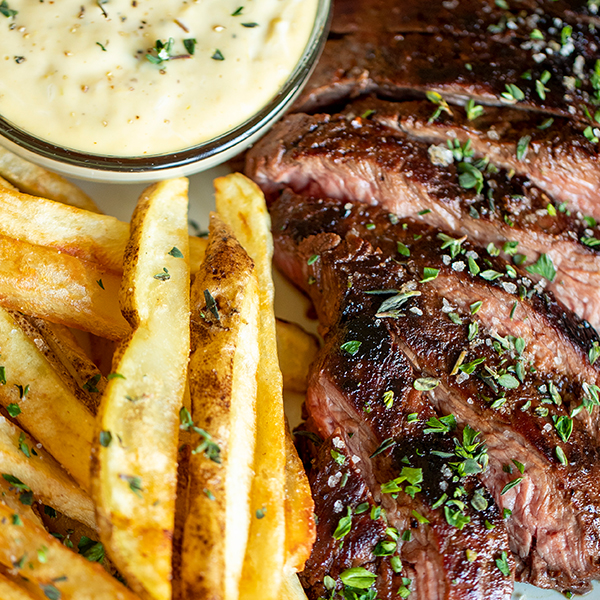 Classic as it gets ~ and a restaurant-worthy dish you can crank out in your kitchen. Steak Frites with grass-fed flank steak and a lemon and thyme aioli.