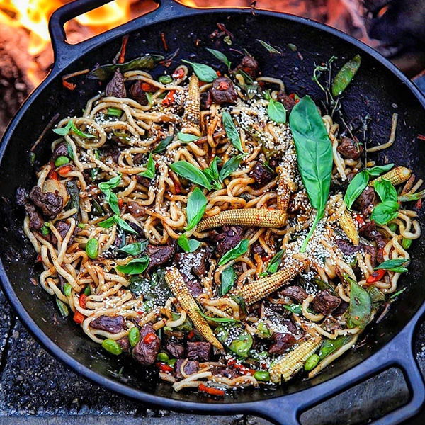 Rest the Lodge Cast Iron wok atop a bed of smoldering hardwoods until piping hot (note: you could easily follow the same recipe by placing the cast iron cookware over your stovetop).