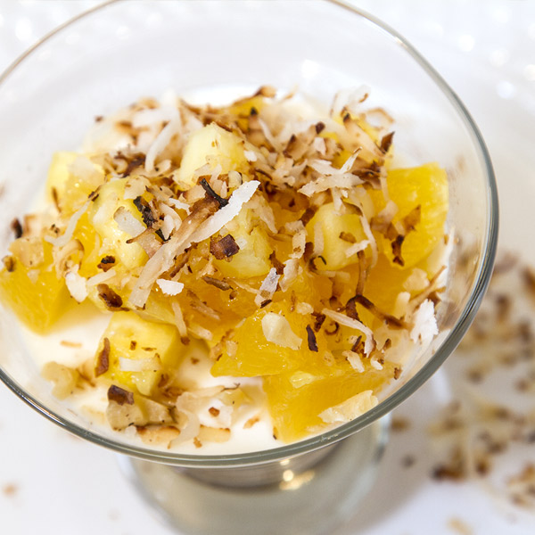 To severe: Mix the orange and pineapple pieces together and spoon over the panna cotta. Then mix the toasted coconut flakes and pecans together and sprinkle over the panna cotta and serve.