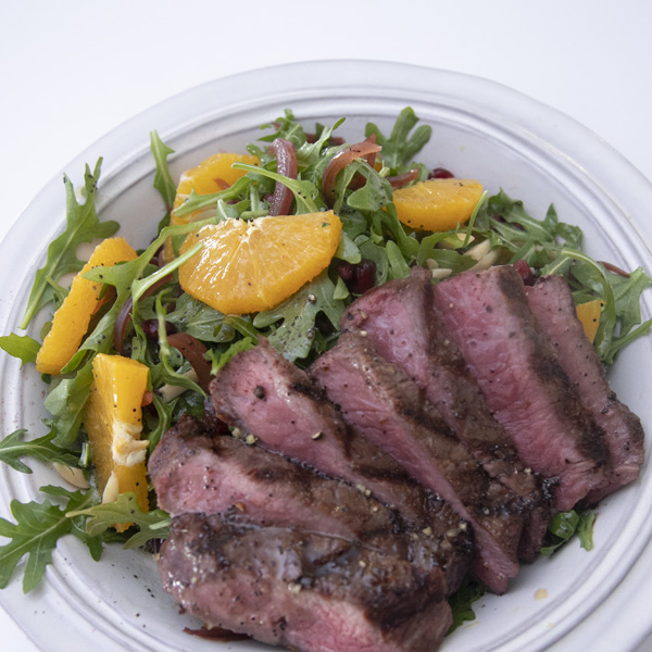 Peppery arugula, savory steak, juicy orange slices, and tangy pomegranate seeds come together for a light and bright winter salad that’s perfectly balanced when paired with our lemon-ginger poppy seed dressing.