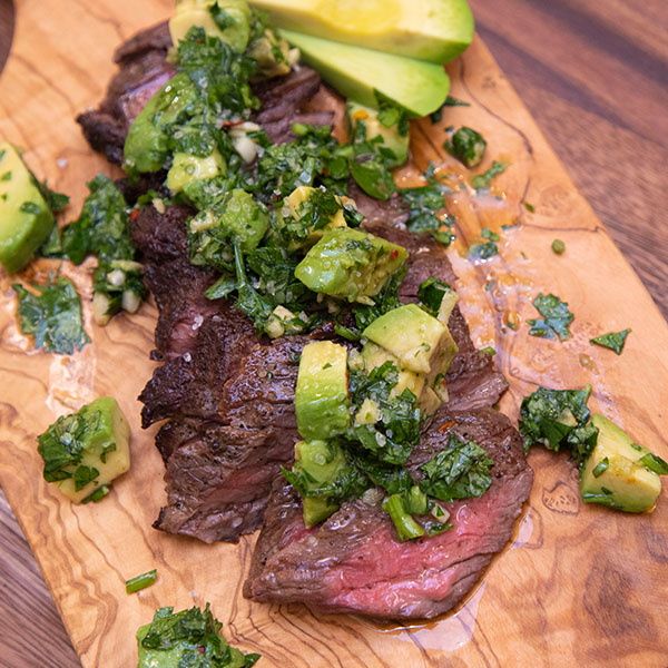 Slice and serve the steak: Hold the carving knife at a 45-degree angle and then slice the steak against the grain, about 1/4-inch thick slices. Transfer skirt steak to a serving plate and either top with avocado chimichurri sauce or put the sauce on the side.