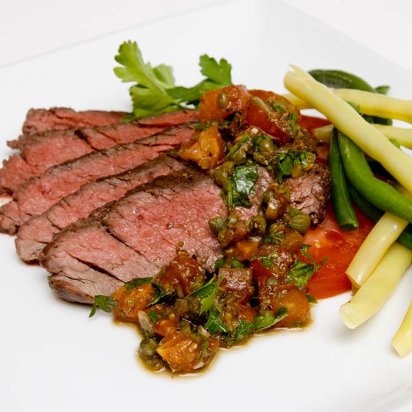 A tomato-based vinaigrette is an unexpected and delicious way to sauce a meaty bavette steak. As the steak rests after cooking, the brightly flavored vinaigrette warms in the savory pan drippings. It’s a match made in heaven.
