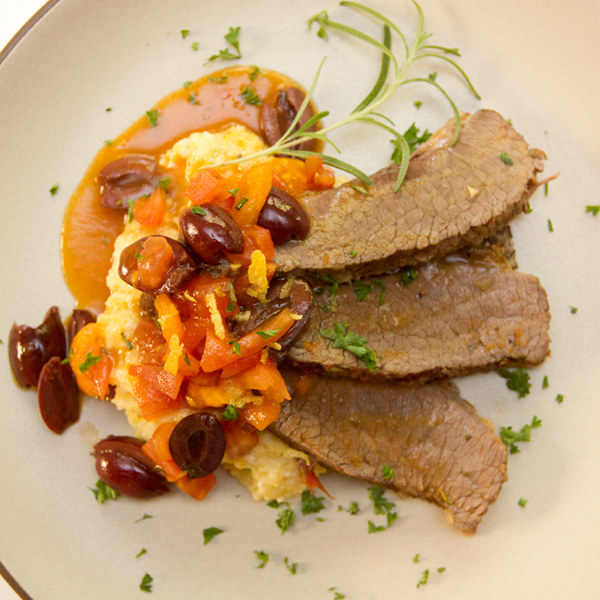Thinly slice the beef across the grain. Arrange the beef slices over soft polenta and spoon the sauce over top.