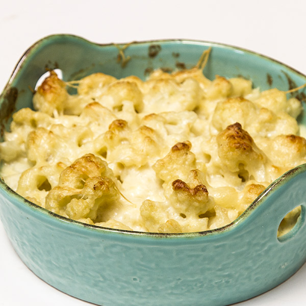 In a medium saucepan over medium heat, melt the butter. Add the shallot and a pinch of salt and cook slowly, stirring occasionally for 2 to 3 minutes, until the onion is translucent. Sprinkle in the flour and cook, stirring constantly so the roux does not color, for 3 minutes. Whisk in the milk and cream until fully incorporated. Bring to a simmer, add the bay leaf, peppercorns, and cloves. Lower the heat, and simmer gently, whisking occasionally for 30 minutes. Remove the sauce from the heat and whisk in nutmeg, pepper, and adjust seasoning to taste. Strain the sauce through a fine-mesh strainer, add the cheese, and whisk to melt. Add the cauliflower and toss well. Transfer to a baking dish and sprinkle more parmesan cheese on the top. Bake for 20 minutes.