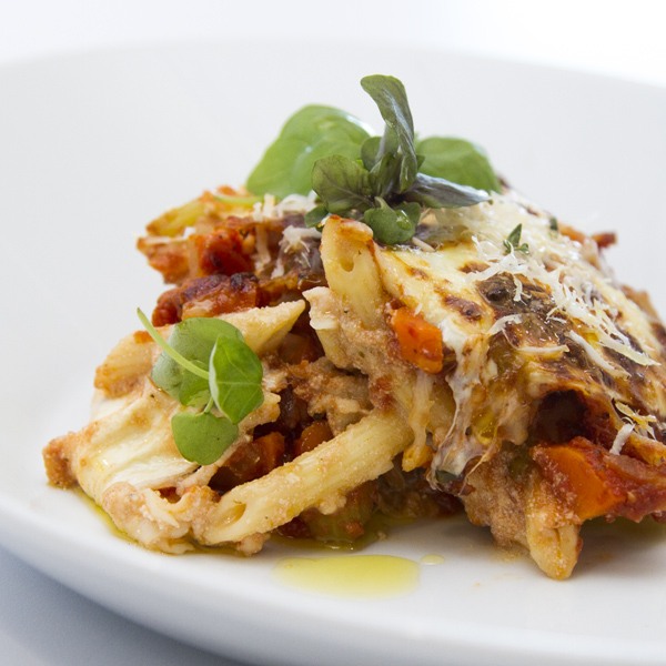 To a pot over medium heat, add the olive oil. Add the tenderloin tips, season with salt and pepper, and sear until nicely browned. Remove to a bowl. Add the onion, carrot, and celery and cook until soft, about 3 to 4 minutes. Add the garlic and cook another 1 to 2 minutes. Add the crushed tomatoes, whole tomatoes, Italian seasoning, and red pepper flakes. Return the beef to the pan. Season with salt and pepper. Bring to a boil, reduce heat and let simmer for 25 to 30 minutes. Meanwhile, cook the pasta in a large pot of salted water until just barely al dente. Drain and rinse under cold water to stop the cooking process. Set aside. Remove 3 to 4 cups of the cooked sauce to a bowl and set aside to cool.