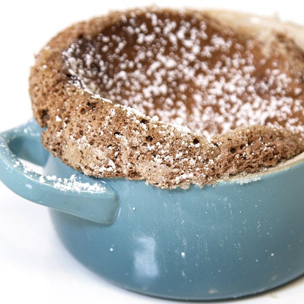Spoon the soufflé batter into the prepared ramekins about three quarters full. Bake the soufflés for about 15 minutes (depending on the size of your ramekins), or until they have risen and the top is set. Sift a little powdered sugar over top and serve immediately.