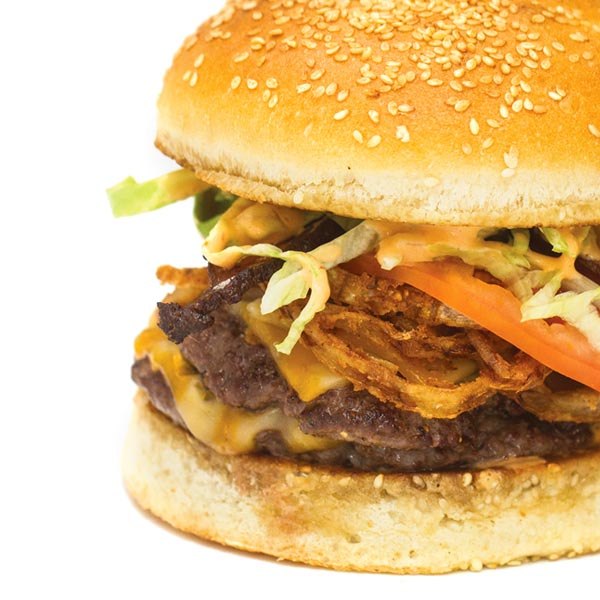 Heat a griddle to high. Season burgers with salt and pepper and sear each patty very quickly on each side; top each patty with a slice of cheese. Toast the buns. Coat the top and bottom buns liberally with Thousand Island dressing. Stack on 2 patties and top each patty with lettuce, tomato, pickles, and lots of crispy fried onions.