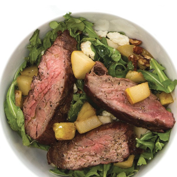 Add the arugula to a large bowl. Arrange the steak strips across the top, then add the pears, pecans, and Gorgonzola. Lightly dress with Mustard Vinaigrette (recipe follows).