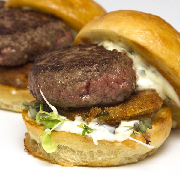 In a bowl, combine the mayonnaise, relish, tabasco sauce, salt and pepper, and set aside. Set up three shallow bowls: one with flour, one with egg wash, and one with bread crumbs. Dredge each of the green tomatillo slices first in the flour, then in the egg wash, then in the panko. Heat a generous amount of oil to 350°F and fry the green tomatoes until golden. Grill the burgers to desired doneness and toast the slider buns. To serve, coat the top and bottom buns with the relish spread, top with burgers, fried tomatillos, and microgreens.