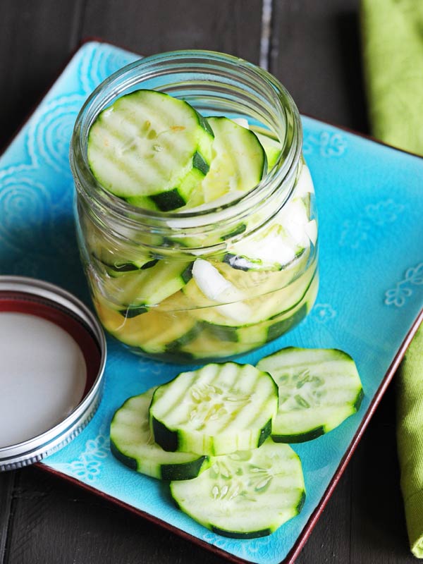 Toss together the cucumbers and onion in a large bowl. Combine the vinegar, water, and sugar in a saucepan over medium-high heat. Bring to a boil, and pour over the cucumber and onions. Cover and place in the refrigerator for one hour or overnight. For a fun presentation twist, use small canning jars to serve this salad in individual portions.