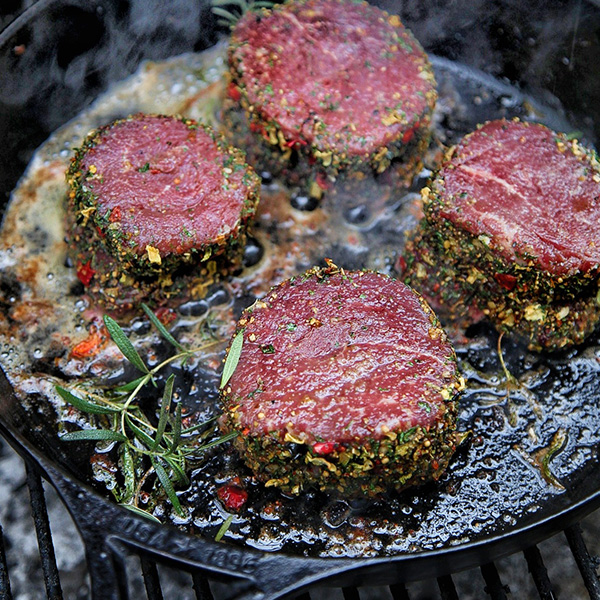Place the seasoned steaks directly into the heated cast iron pan for approximately 2-3 minutes untouched, with the grill lid open. When the steak easily pulls away from the cast iron flip meat over, toss in butter and herbs at head of the pan. Tilt pan head up from heat and repeatedly basted infused butter atop the steaks for 3-4 minutes, encrusting the steak exterior, building layer upon layer of flavor, until the internal temperature reads 130F (medium-rare). *Flip steak back over and continue the baste if temperature is not at 130F after 3-4 minutes on the second side.