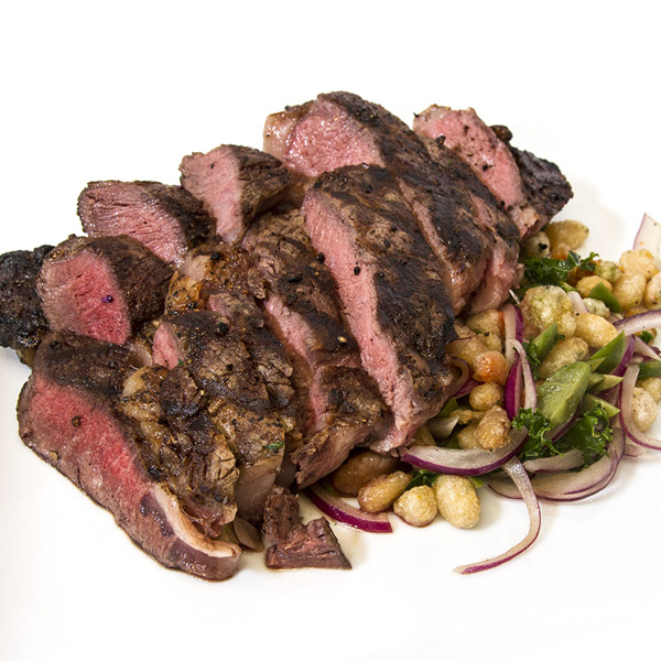 Season steak with salt, fresh cracked black pepper, and extra-virgin olive oil and allow to rest at room temperature for at least 1½ hours. Grill the steak over medium heat, 2 minutes on each side (for medium-rare), then rest for 5 minutes before slicing.