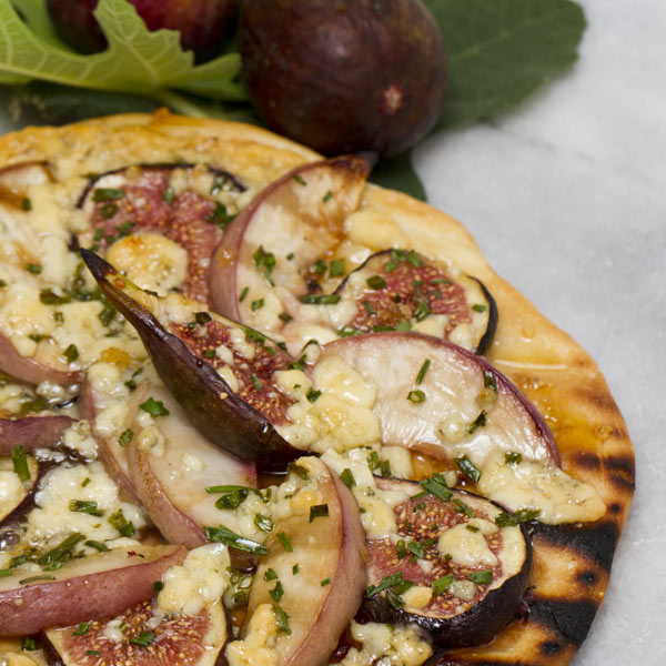 White nectarine slices, figs, crumbled blue cheese, chopped fresh chives, and a drizzle of honey.