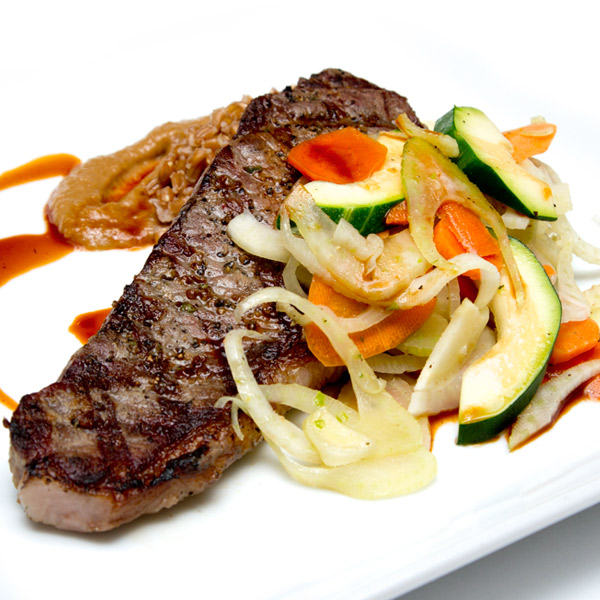 Place the steak on the hottest part of the grill. Grill for 1½ to 2 minutes, then rotate the steak to get cross marks and cook for another 1½ to 2 minutes. Flip and repeat. Remove the steaks once they register 115°F on a thermometer (they will carry over to medium-rare). Let rest for 10 minutes before slicing. Spoon Sherry Current Demi-Glace over top and serve steaks with Caramelized Onion Puree, and Sautéed Zucchini, Fennel & Carrots (recipes follow). Cooked farro is also a great accompaniment.