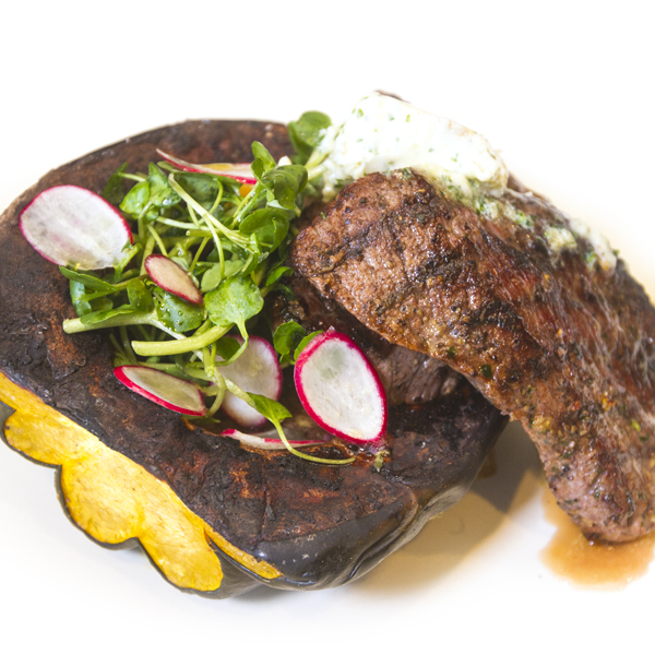 After the meat has rested, slice each steak and serve with acorn squash and a dollop of garlic butter.