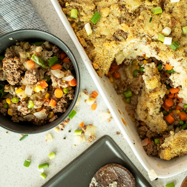 4.To assemble the pie, use a spatula to smooth out the meat filling in the bottom of the skillet or casserole with the frozen mixed vegetables. Spread the mashed potatoes out evenly on top and use the tines of a fork to make swirly patterns in the potatoes, if you like.