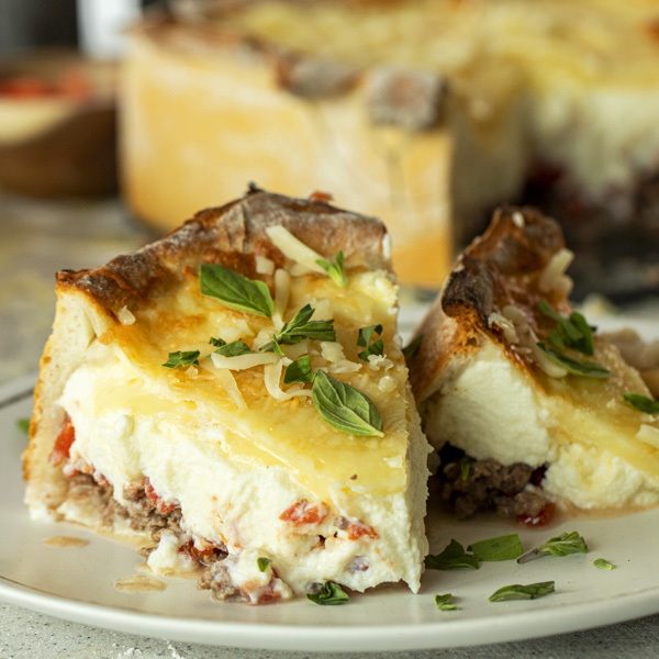 6.Top the ground beef with drained diced tomatoes. Divide the ricotta and mozzarella across the pizza with the garlic powder also sprinkled on.