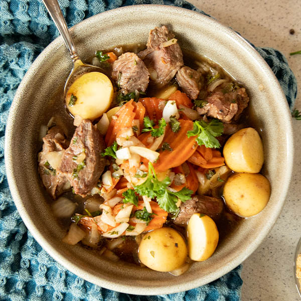3. Add potatoes and carrots to slow cooker. Carefully pour broth over meat and vegetables.