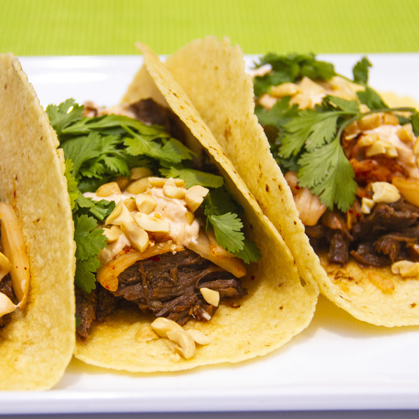 In a small bowl, combine the yogurt and chili sauce. Fill each tortilla with shredded beef, cilantro, peanuts, kimchi, and yogurt-chili sauce mixture.