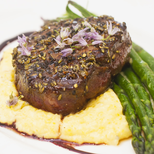 Lavender-Honey Glazed Filets With White Cheddar Grits, Blanched Asparagus & Blueberry Gastrique