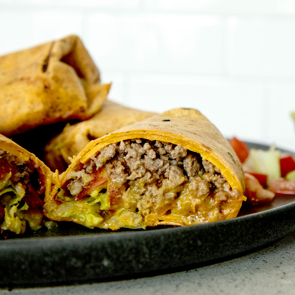 3.In the upper-center of the wrap place a slice of cheese and ½ cup of the beef mixture. Add tomato and lettuce. Then, add some ketchup, mustard, and any other toppings you would like. Roll up and enjoy.