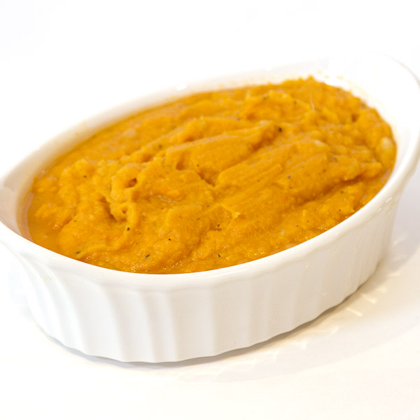 Preheat the oven to 350°F. Place the potatoes in a baking dish and bake in the preheated oven for 50 minutes. Remove from the oven and use a spoon to scoop the meat of the potatoes from the skins. Use a whisk or a ricer to mash the potatoes into a smooth consistency. Add butter and hot cream and continue to mix. Season with salt and pepper as needed.