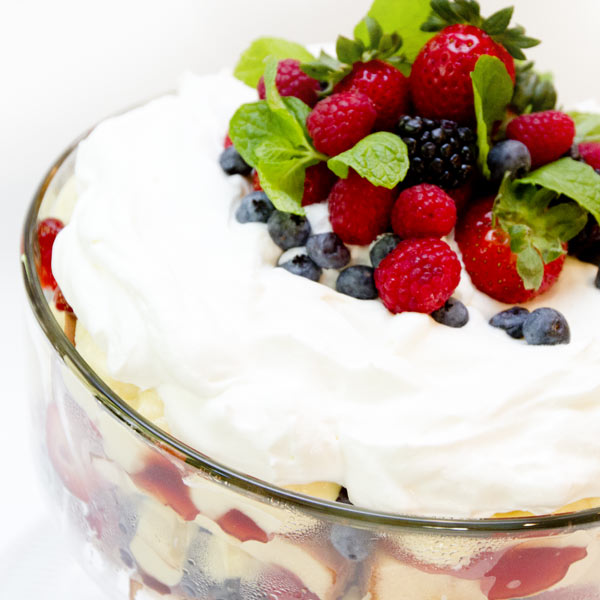 Remove the trifle from the refrigerator about 1 hour before serving and let sit at room temperature. Top with the whipped cream and remaining fresh berries and serve immediately.