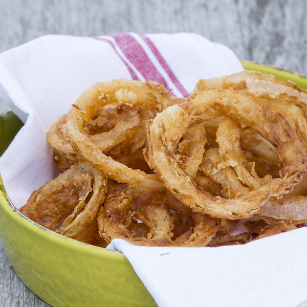 When ready to cook, combine the flour, salt, and garlic or onion powder in a large bowl. Heat a pot of canola oil, a couple of inches deep, to 360°F (use a candy thermometer to monitor the temperature). Drain the onions from the hot sauce, dredge them in the seasoned flour, and toss to coat. Shake off excess flour and fry in hot oil for about 3 minutes, until golden brown. Season with additional salt if desired.