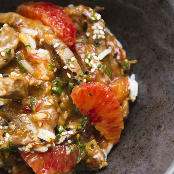 Pour juice mixture into skillet, scraping the bottom of the pan to deglaze. Boil until the sauce begins to thicken, about 1 minute. Return beef to skillet, add orange segments and green onions, and toss until coated and heated through. Sprinkle with sesame seeds and serve with steamed rice.