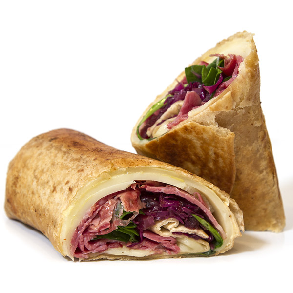Place the wraps flat on a work surface and spread evenly with the Horseradish Mustard Sauce. Layer the cheese, pastrami, cabbage, and spinach in the center of each wrap. Fold in the sides and roll up tightly.