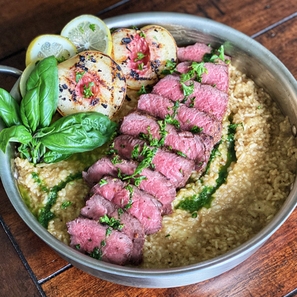 5. Add sliced sirloin over risotto and finish with your garnishes.