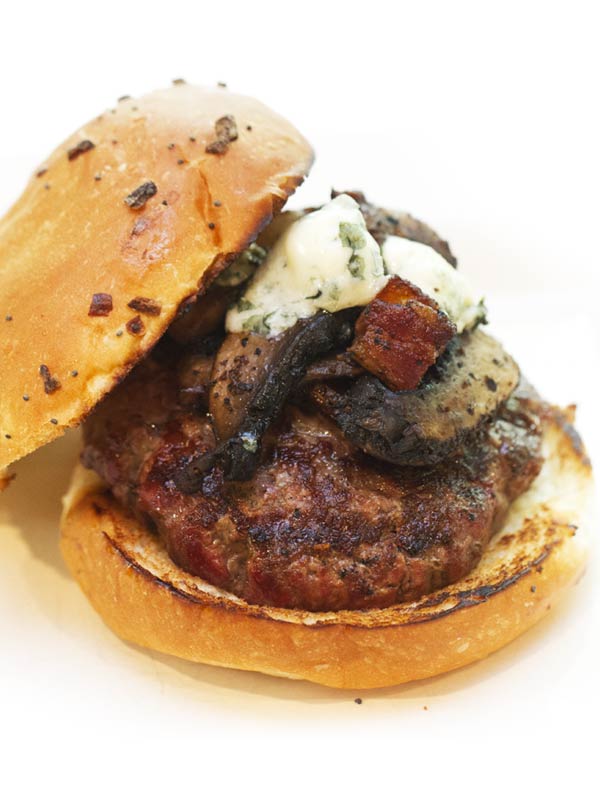 Place the burgers on the grill over direct heat, and grill for about 8 minutes. Flip the burgers over and cook for another 3 minutes. Move the burgers to indirect heat and top them with the sautéed bacon, mushrooms, and roasted garlic. Add crumbled gorgonzola cheese on top. Place the lid back on the grill and cook for another 4 minutes. The cheese should be melted and the temperature of the burgers should be about medium (about 140°F to 145°F).