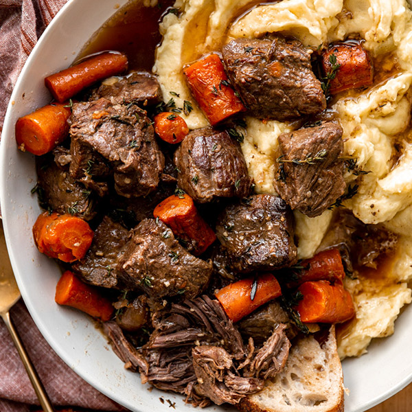 Pot Roast Braised Beef is the ultimate comfort food dinner option. Pieces of beef are simmered low and slow in a classic pot roast fashion until fall-apart tender. With carrots, onions, fresh herbs and a decadent broth, this Pot Roast Braised Beef will easily become a family favorite that you won’t be able to resist!