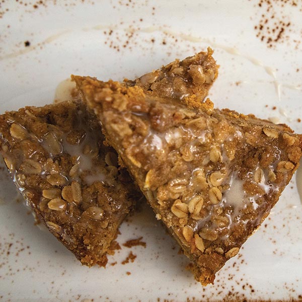 Bake for about 50 minutes in an oven heated to 325°F; cover the bars with foil after 35 minutes to prevent the streusel from burning. The bars are done when the edges are lightly browned and the center is mostly set (it should jiggle only slightly). Cool for 1 hour, then transfer to the refrigerator to chill for 3 hours or overnight. Drizzle bars with Vanilla Icing (recipe follows) before serving.