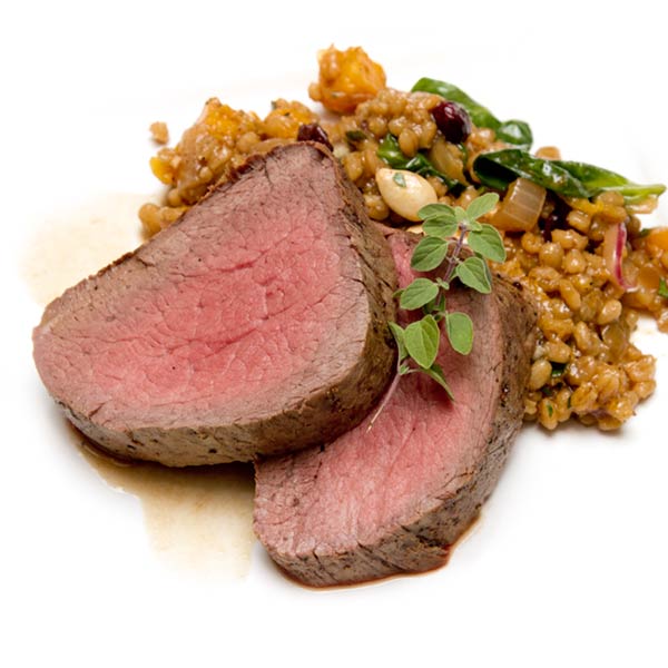 Preheat oven to 400°F. Add canola oil to a heavy bottomed pan and heat until almost smoking. Season the roast with salt and pepper and sear on all sides. Remove from pan, place on rack, and roast in oven for 15 minutes for rare, or until internal temperature reaches desired doneness; a kitchen thermometer inserted into the roast should read 120°F for medium-rare, 125°F for medium. Let rest for about 5 to 10 minutes before slicing. Slice and serve with Smokey Bourbon Jus and Butternut Squash and Farro Salad.
