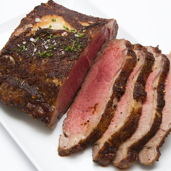 When you’re ready to cook, preheat a convection oven to 375°F (400°F for a conventional oven). Meanwhile, remove roast from refrigerator and let it rest at room temperature for at least a half hour. Transfer the roast, with the fat cap facing up, to a rack inserted into a low-sided roasting pan and cook for 25 minutes (35 minutes for a conventional oven). Turn off the oven and leave the door closed. Leave the roast in the oven for another 25 minutes. Remove from the oven and rest for another ten minutes. Slice against the grain.