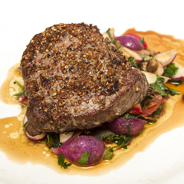Both the Certified Piedmontese flat iron and the sirloin work well in this dish. The subtle bite of coarsely ground peppercorns is balanced with fresh watermelon radishes and savory pancetta for a well-rounded dish that’s easy to enjoy.
