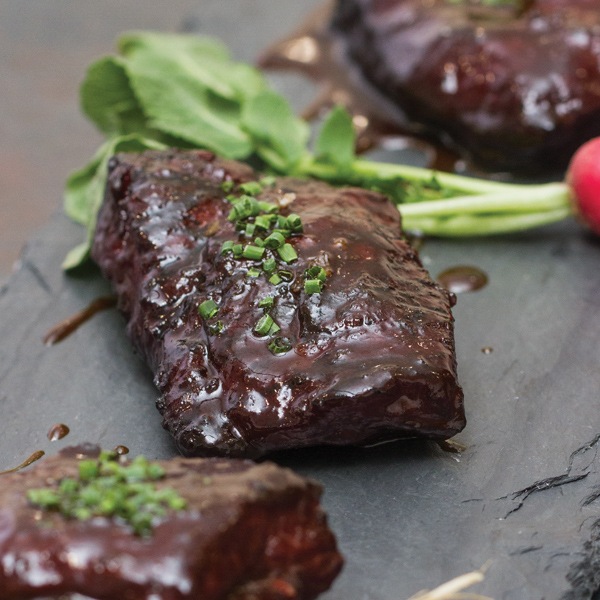 Smoke the ribs for about 2 hours, being careful not to give them too much heat. Transfer to a roasting pan and add chicken stock and butter and evenly coat each short rib with glaze. Cook in a 300°F oven for an hour, basting with sauce or glaze every 15 minutes. Cook until the short ribs are fall-apart tender.