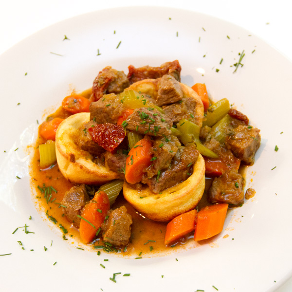 I love this warm Irish classic and serve it in the winter months in my restaurant. We serve it with a Yorkshire pudding, which is a British baked bread made from a thin batter. The results are dramatic and fairly easy to attain.