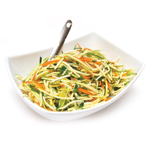 For convenience, use a Japanese mandolin (available at most Asian markets) to julienne the vegetables for this fresh summer slaw. You can use most any summer squash here, and the cut makes the vegetable so delicate that no cooking is required. For something unique, try adding beets, apples, parsnips, sweet potatoes, or cucumbers to the mix.