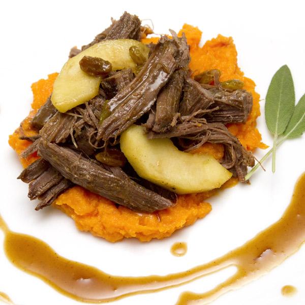 The combination of warming spices (allspice, coriander, black pepper, and ginger) adds an exotic flavor note to this dish. During braising, the apples collapse, mingle with the braising liquid, and become a spicy-tart-sweet, fruit compote-style sauce. For best flavor, season the brisket with the spice rub 12 to 36 hours ahead.