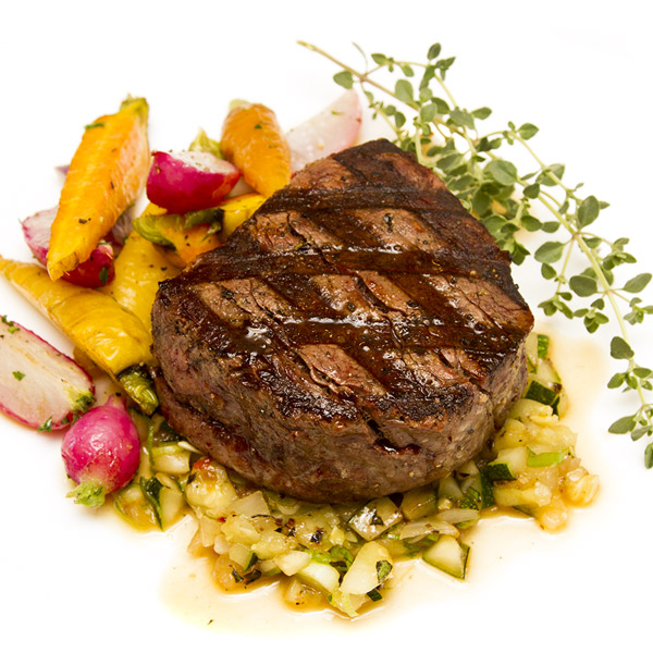 Light your gill or preheat a grill pan to medium-high heat. Toss the zucchini and onion in the olive oil, season with salt and pepper, and grill on both sides, being careful not to overcook—these vegetables need to still have a crunch to them. Once cooled, dice the zucchini and onions small and combine with the rest of the ingredients in a mixing bowl. Allow to marinate for 10 minutes. Check the seasoning and serve with a grilled Certified Piedmontese ribeye, filet, or your favorite cut.