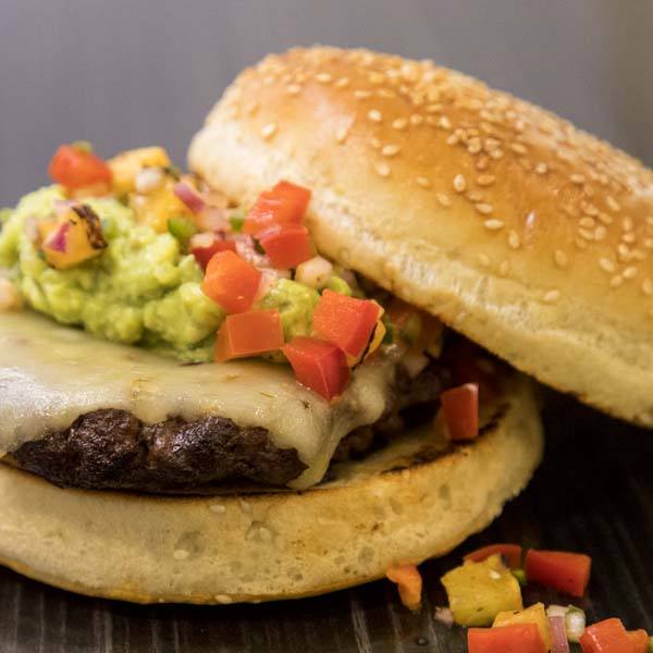 Divide the ground beef into four (4-ounce) patties and form into 5-inch patties, slightly larger than the buns. Cook burgers over high heat to desired doneness. Top with pepper jack cheese and remove from heat. Butter and toast buns. Spread guacamole (recipe follows) on the top and bottom of buns. Place cheese burger on bun and top with a generous portion of Grilled Pineapple Salsa (recipe follows).