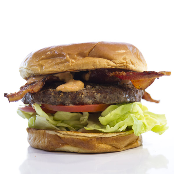 Season burger patties with salt and pepper and grill to medium rare. Toast buns with butter. Combine the ketchup, mayonnaise, relish and Sriracha with the remaining salt and pepper and spread on top and bottom buns. Assemble the burgers: Arrange butter lettuce leaves and tomato slices on bottom buns, stack with burger and slices of bacon, then top bun. Serve immediately.